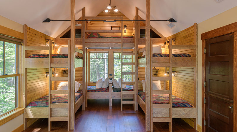 Seven beds in the bunk room, each with its own reading light, and a pullout couch provides ample space for overnight guests and a bathroom.
