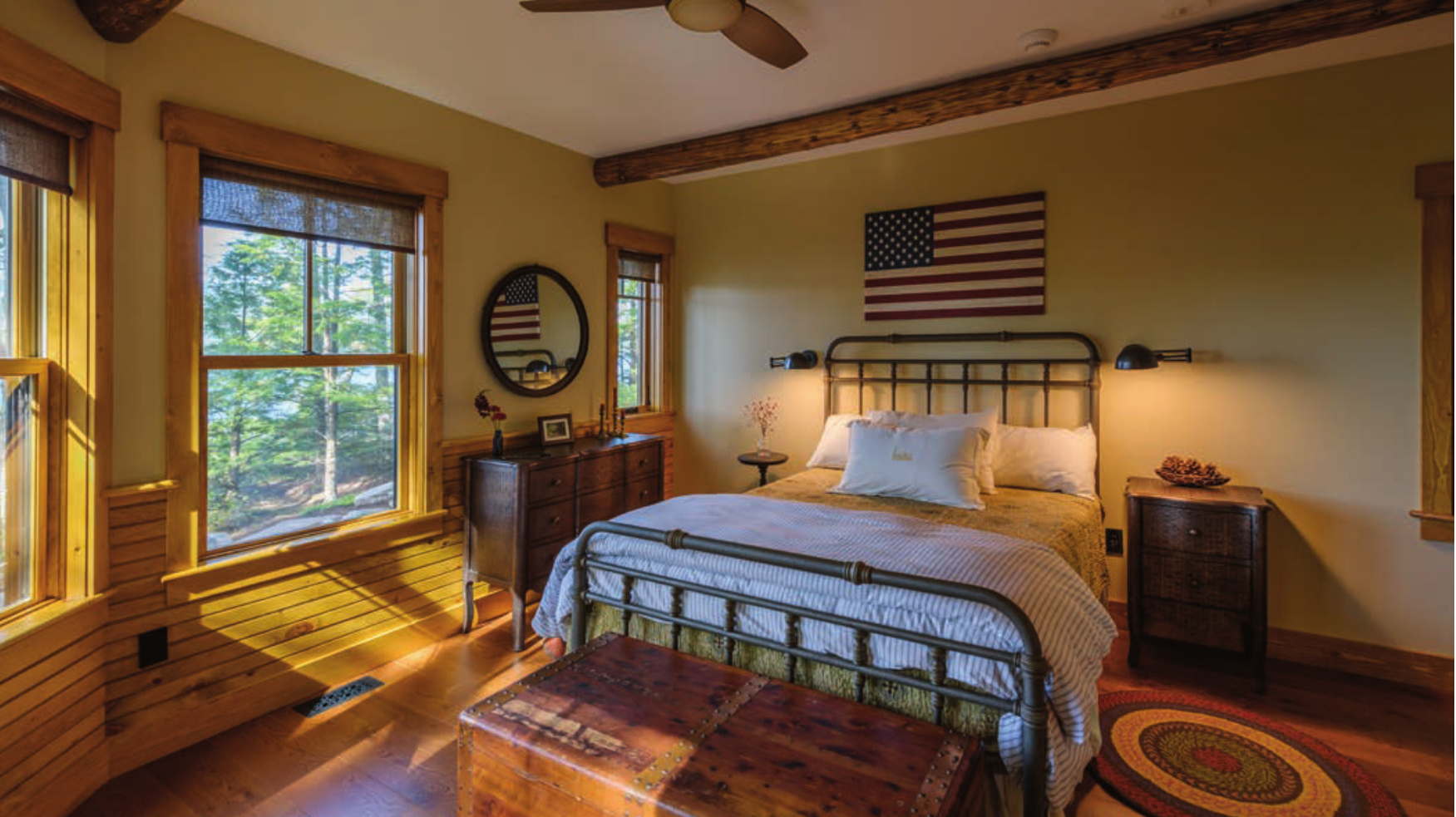 Double doors lead to a deck with iron detailing and an exterior spiral staircase. A five-paneled door was repurposed from the previous cabin and is now used for a large linen closet.