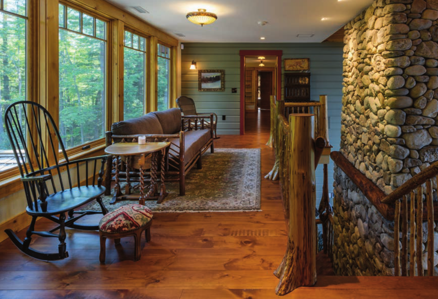 That can be seen on the second floor of the great room; French-style windows with wavy glass from the original cabin swing out freely.