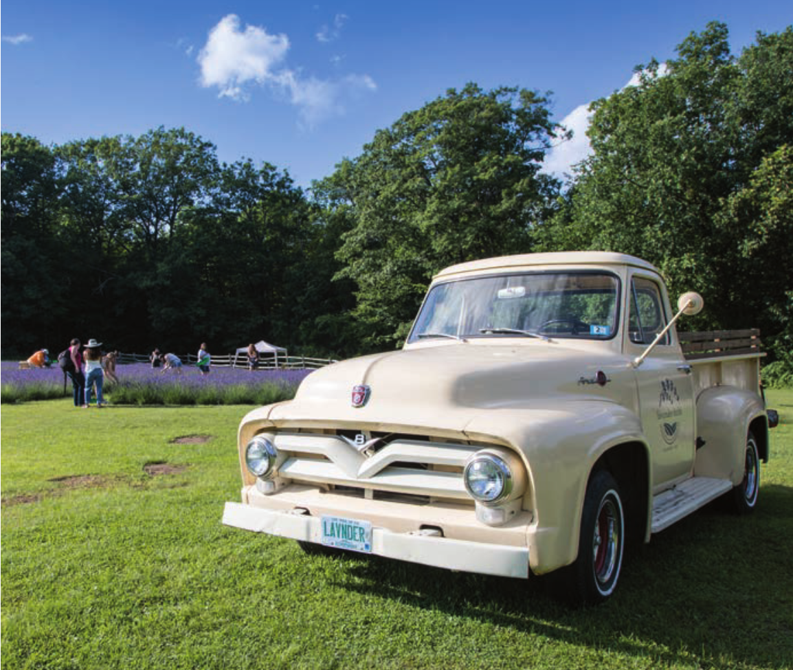 Lavender crafts and wreath-making are extremely popular with all ages, and this summer there will be a special class for kids called Lavender 5 Ways, showing how lavender can be enjoyed through all the senses. Their daughter has rabbits and a flock of chickens for the kids to see and pet. They encourage people to visit the farm, sit and enjoy the view, bring a picnic lunch, stroll through the fragrant field of lavender, take a walk on their shady nature trail and top off the day with a lavender lemonade or homemade snack. While you are there, be sure to snap a selfie sitting in Ellie—their vintage 1955 Ford pickup.