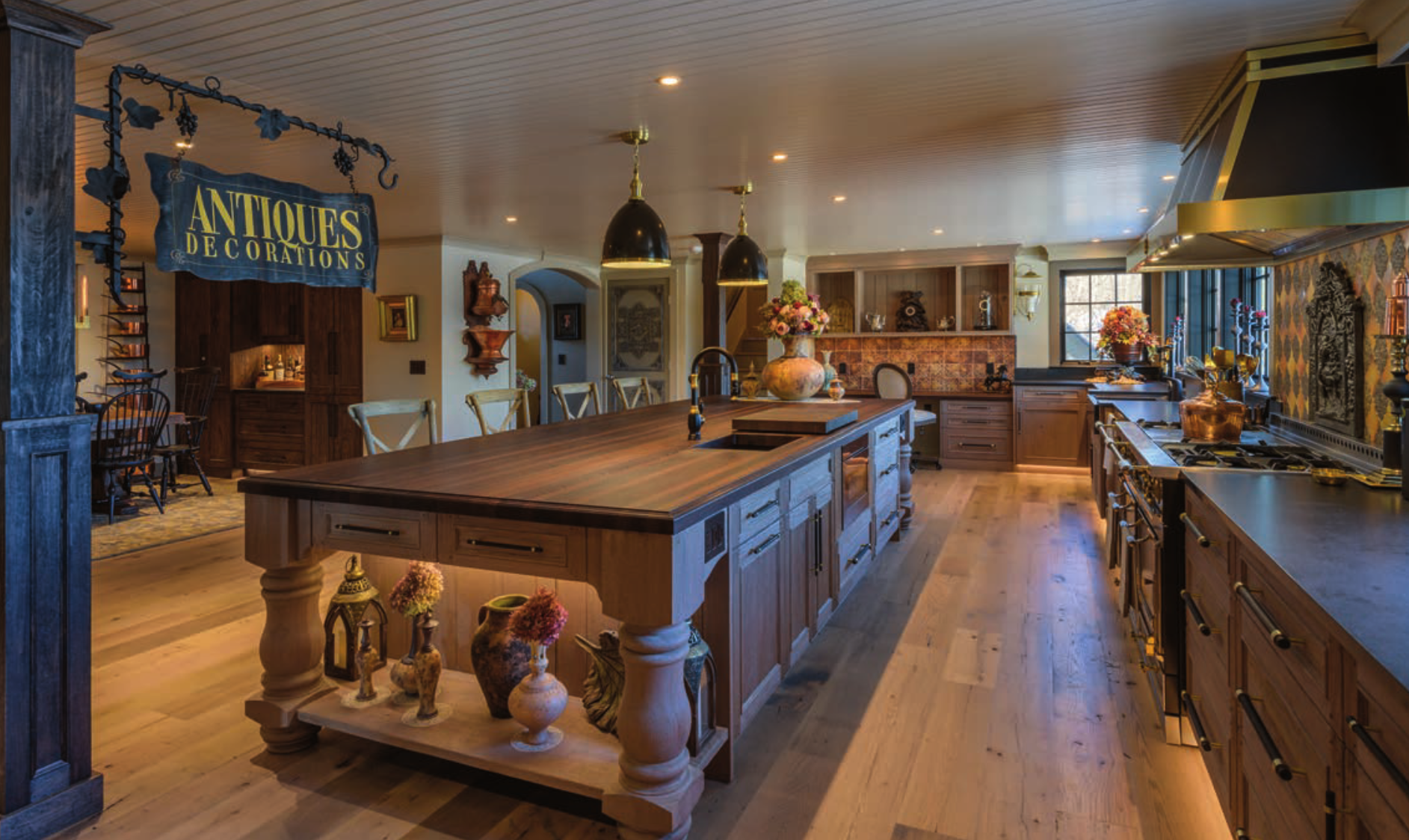 The island also has a drawer microwave oven, extra storage and a granite sink for prep work. Open shelving for vases and other antiques adds personal style and sophistication.