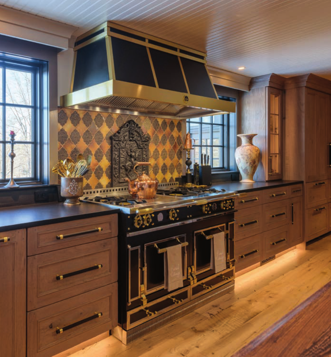 A custom-made, double oven range by French designer La Cornue features a diamond-shaped tile backsplash by Portico Fine Tile & Design, which provided all the tile and backsplash design work.
