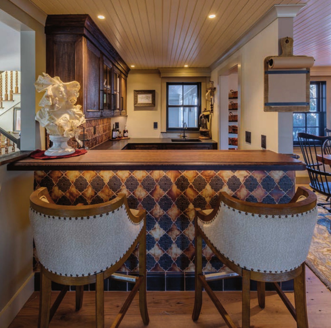 For the bar backsplash, the client chose a Deseo Mission Pattern from Portico, also in burnt umber.