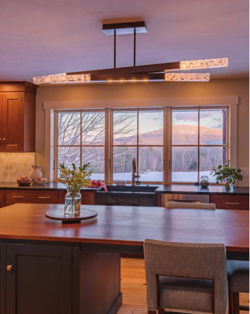 A distinctive, linear fixture from Hammerton Lighting illuminates the turquoise island, while oriental rugs from Little River Oriental Rugs in Concord and refinished pine floors bring durability.