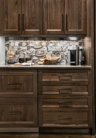 Cabinets in “walnut portobello” provide extra storage space to keep counters empty.