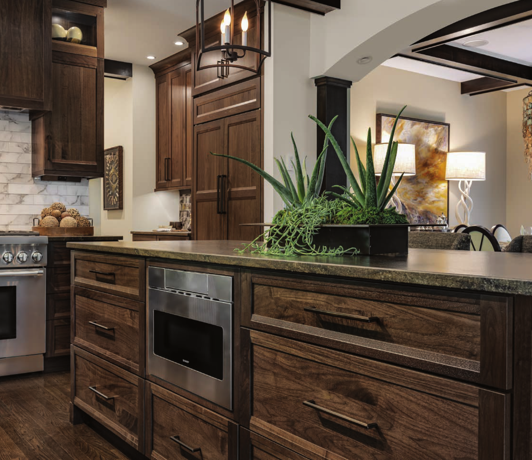 For example, a South African chandelier ties the eat-in area with the kitchen.